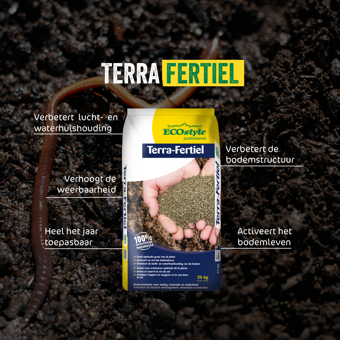 Terra-Fertiel kan met recht een bodemactivator genoemd worden. Het bevat een groot aantal micro-organismen in de vorm van schimmels, bacteriën en gisten. Terra-Fertiel is tevens verrijkt met zeewier, kalk en kleimineralen. Het stimuleert en activeert het bodemleven, waardoor belangrijke bodemprocessen zoals omzetting van organische stof en natuurlijke structuurverbetering optimaal verlopen.